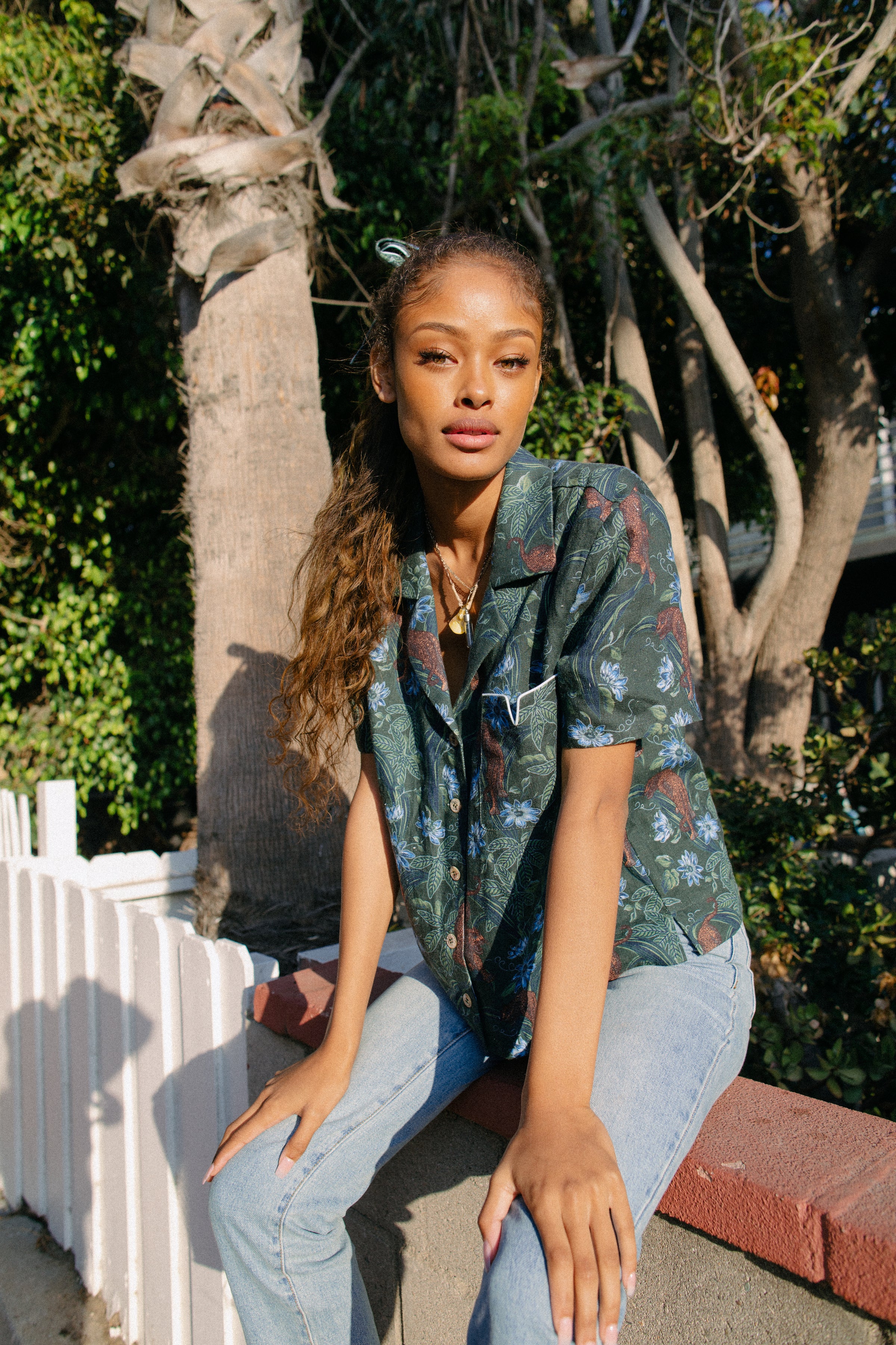 Chalk blue v-piped pocket. Original Tombolo artwork: this print depicts a Jaguar, foliage and flowers. Reverse-engraved Agoya shell buttons.This shirt also comes in white and a dark green / white scramble.