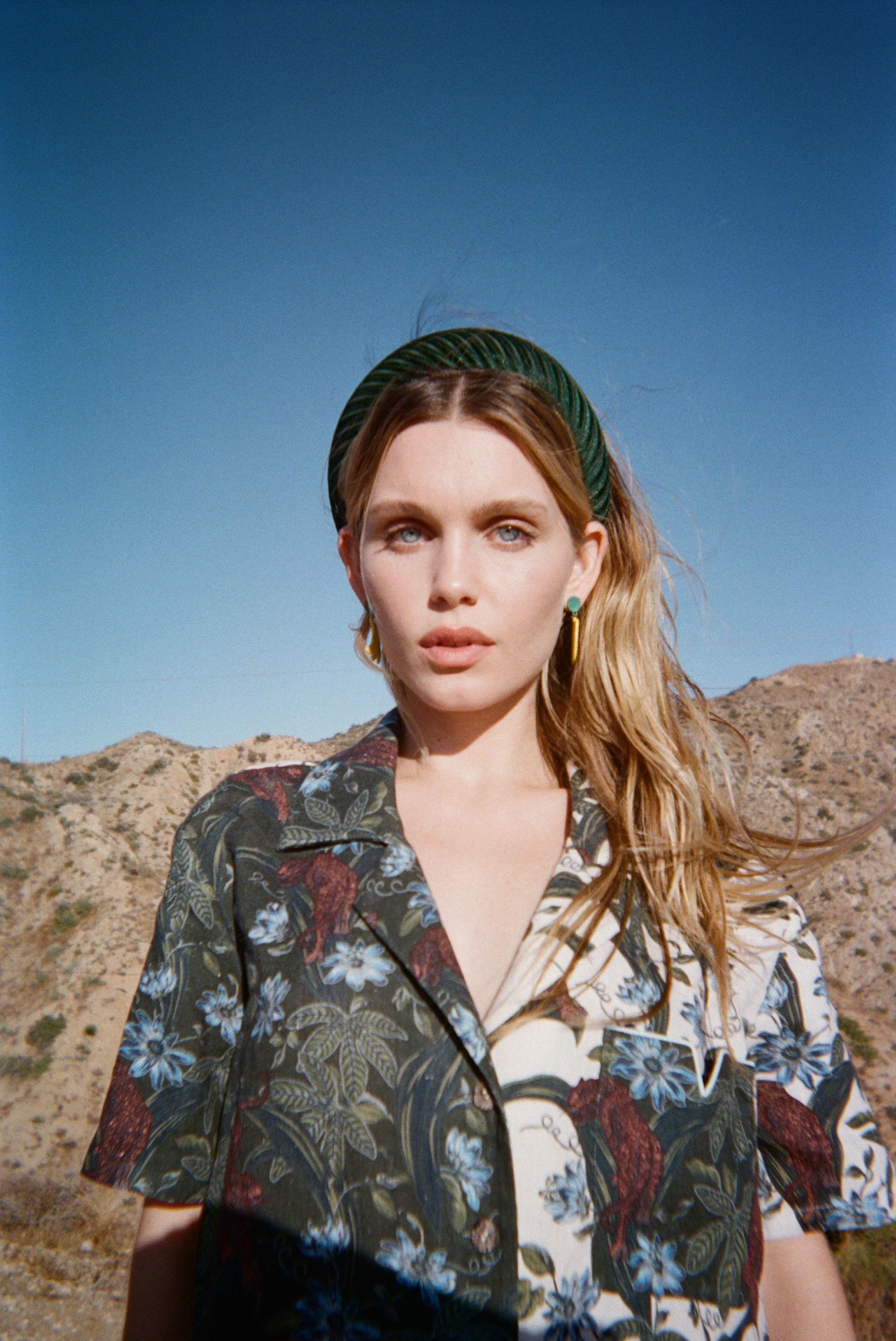 Chalk blue v-piped pocket. Original Tombolo artwork: this print depicts a Jaguar, foliage and flowers. Reverse-engraved Agoya shell buttons.This shirt also comes in white and dark green.