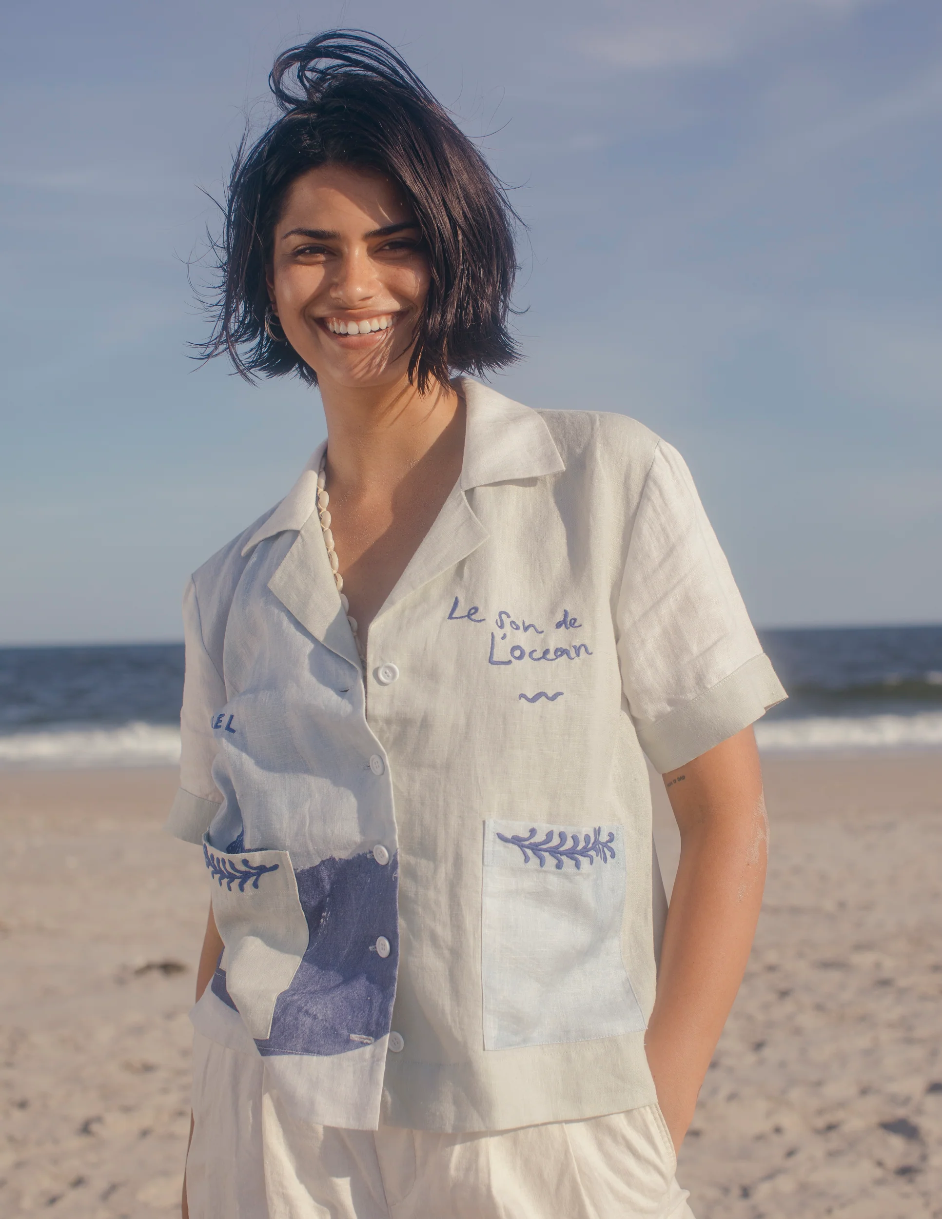 Hôtel Magique is a graphic design brand created by Dutch artist Milou Neelen. From her current home base in Bali, Milou has created a world of nostalgic escapism. The goal of our second collaboration was to add a second layer of artistry by capturing her brushstrokes on digitally printed linen. We overlaid embroidered elements to add to the effect.