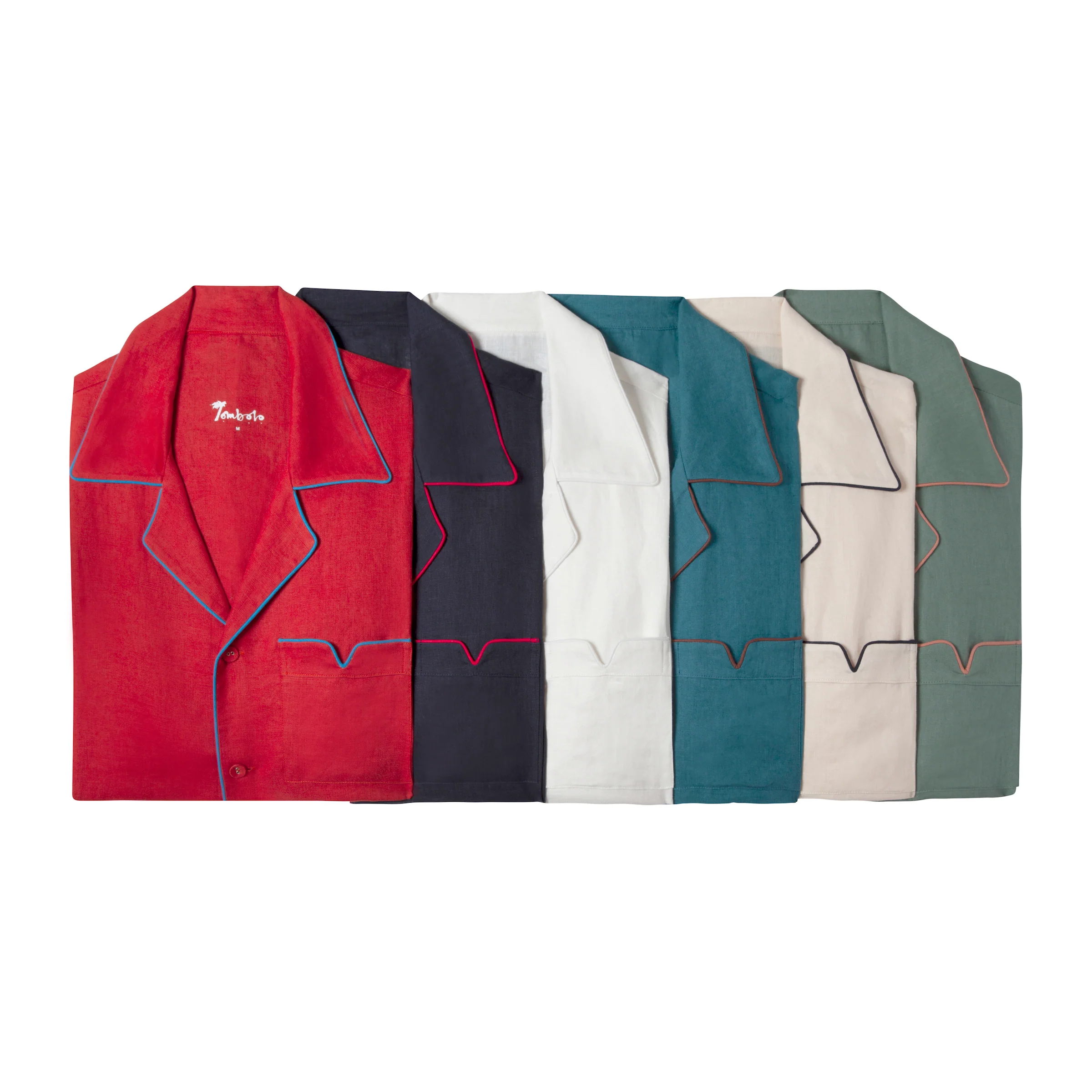 Heavyweight linen that ensures wrinkle-resistance, easy machine-washable care, and breathability. Blue piping and Tombolo "V"-shaped pocket. Self-fabric-wrapped buttons add a dollop of nostalgia.